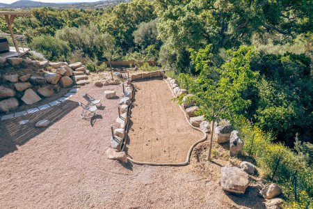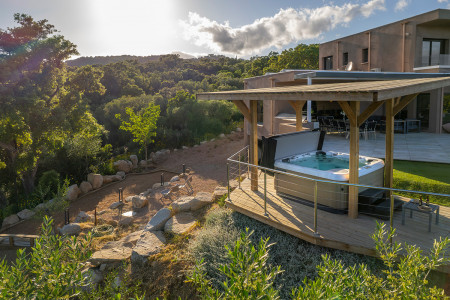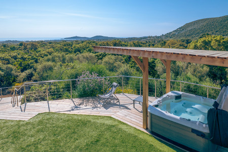 Le terrain arboré et planté d'essences locales offre une vue panoramique mer et montagne et dispose d'un spa, d'un terrain de pétanque et d'une table de ping-pong.