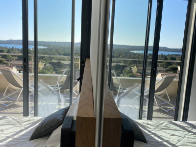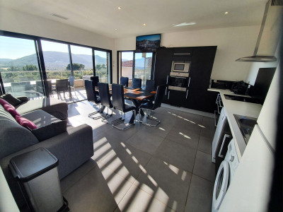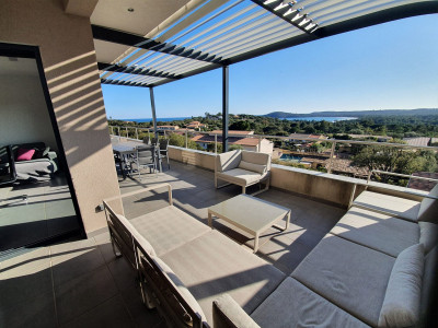 - Terrasse couverte 60 m2, vue sur Pinarello et sur la piscine, spa, barbecue à gaz, table, chaises et transats